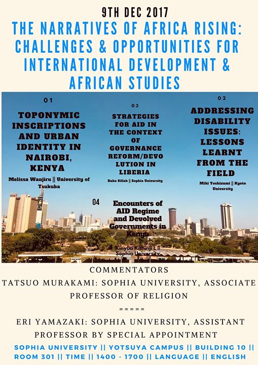 In the month of December, we hosted a workshop facilitated by the Sophia University Graduate School of Global studies workshop series to discuss the topic on Africa rising. This workshop intended to bring into core the possibilities in the narratives of Africa rising in terms of Africa